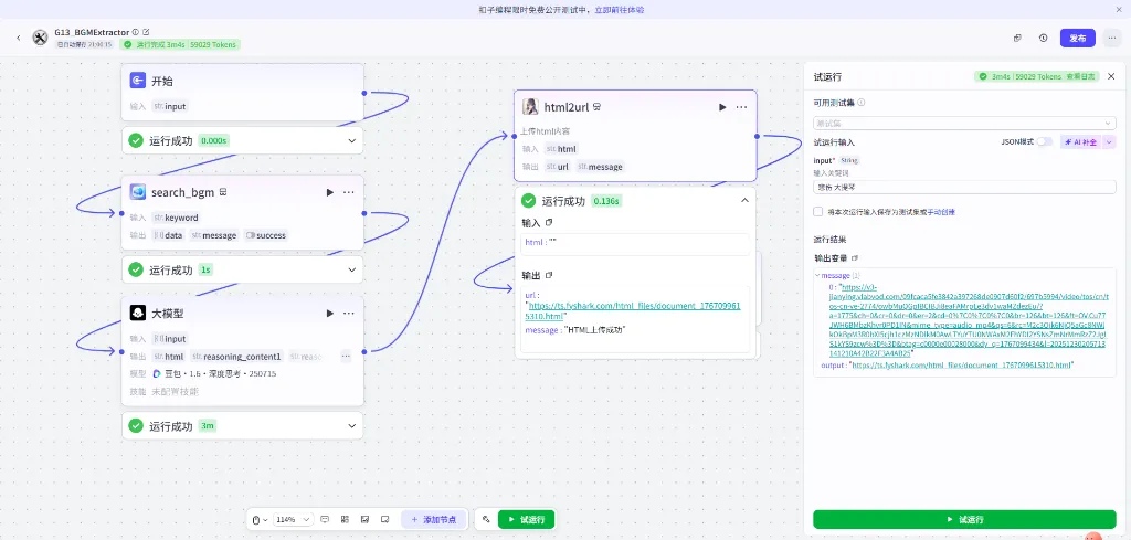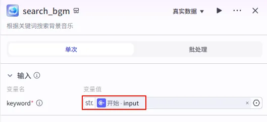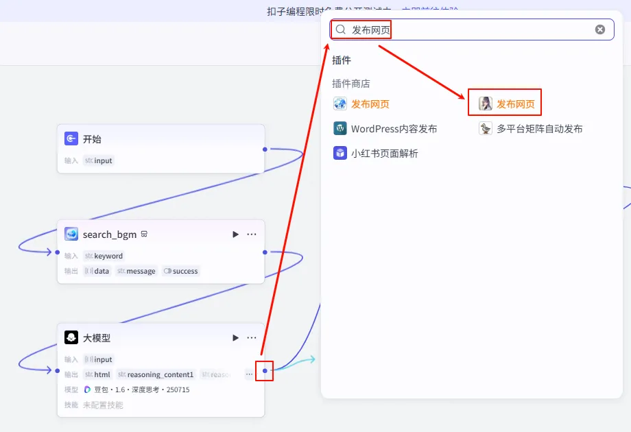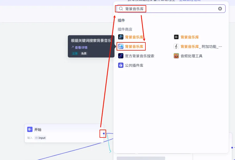 2. 搜素 BGM (Search Plugin)这也是 Coze 的隐藏神器。搜索并添加 背景音乐库 插件,选择 search_bgm 工具。