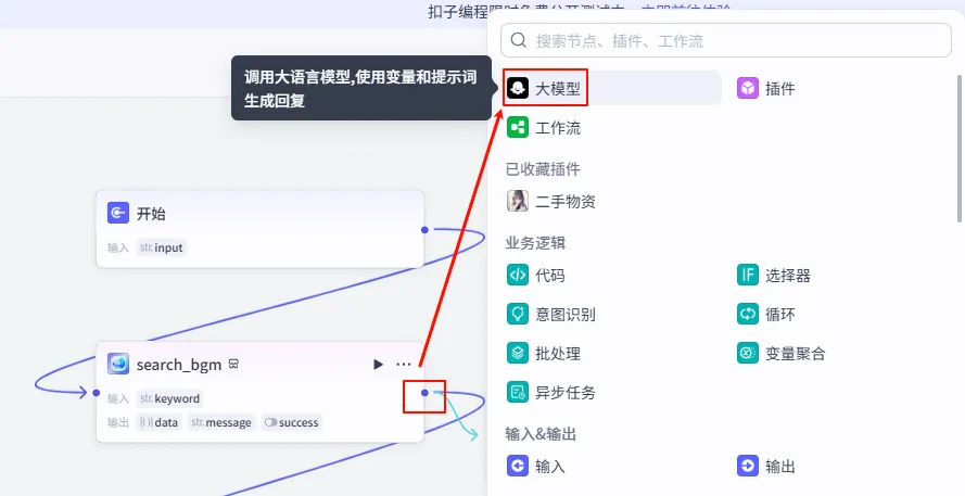 第一步:添加大模型节点从节点库添加 大模型 节点,如下图所示: