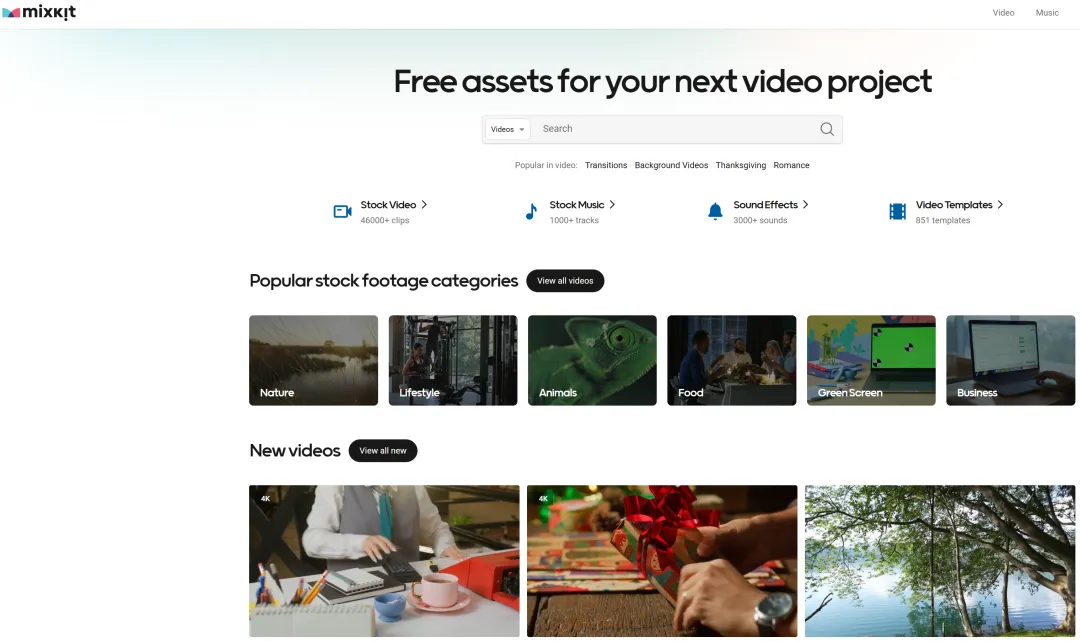 2) Mixkit(想要“听起来像正经商用片”的免费库)