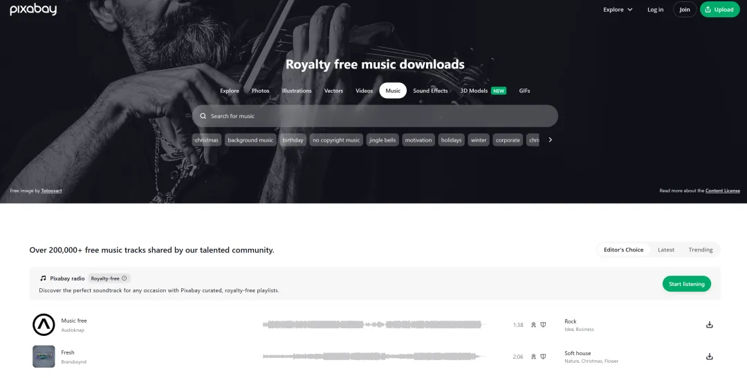 4) Pixabay Music(资源多,但“可能遇到 Content ID 声明”要有心理准备)