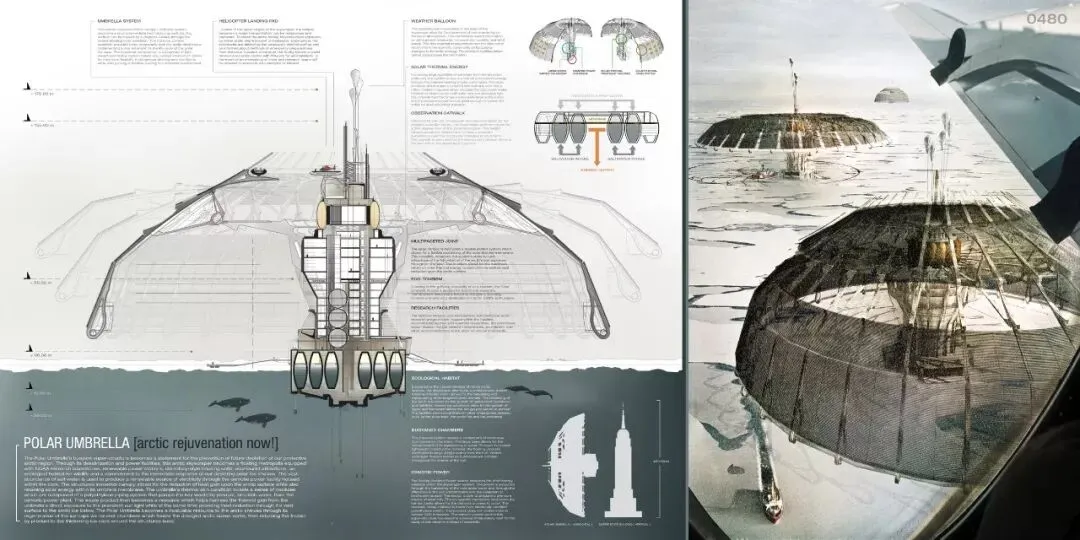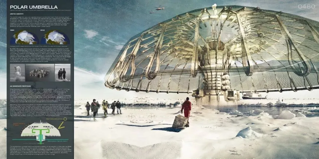 第一名获奖作品:Polar Umbrella Buoyant Skyscraper Protects and Regenerates the Polar Ice Caps