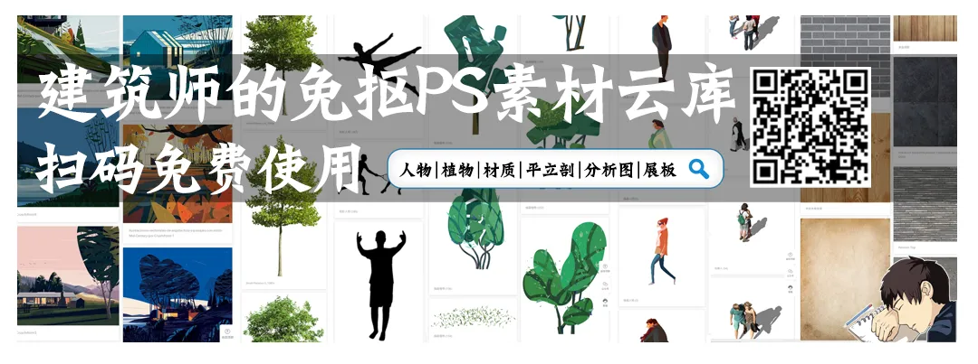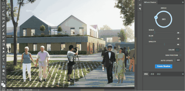 同样,一些同学在绘制透视图时,通过复制图层,变换方向,橡皮擦除或是PS模糊来制作比较真实的阴影,步骤复杂不说,人物或是配景植物的数量一旦大起来,也会造成时间不够、PS卡顿、阴影方向不对等等问题。