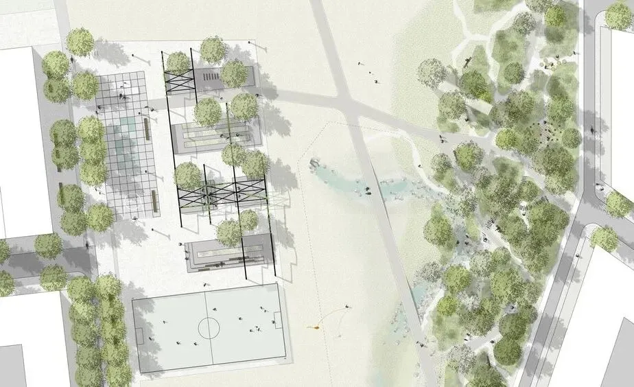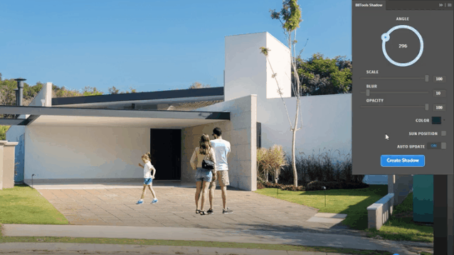 当效果图复杂起来了,每个配景的阴影都有着统一的光源,然而若是此时我们的阴影没有根据透视统一的话,效果图怎么看怎么怪!这时候,我们可以使用一键阴影神器(BBtools Shadow)的同步光源功能,勾选“太阳位置”用路径工具单击创建发射点,之后创建的阴影方向都会与之同步啦~