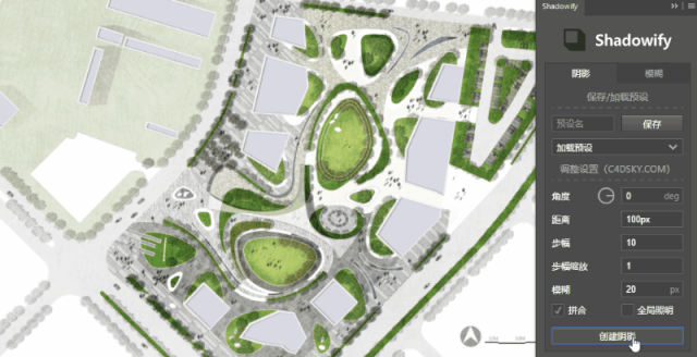 我们可以创建阴影,也可以通过全局光调整方向,还可以将常用的阴影和模糊设置另存为预设,以供以后使用。