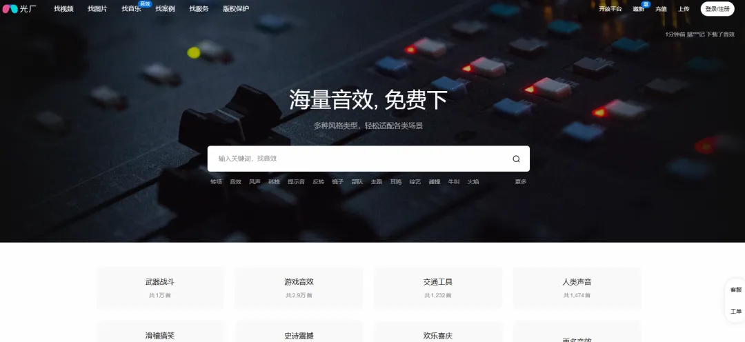 作为中国本土领先的音效素材平台,光厂成立于2012年,由成都光厂创意科技有限公司打造,专注服务国内创作者生态。平台汇聚超500万条音效资源,其中节日庆典类占比近15%,涵盖春节鞭炮、圣诞颂歌、国庆庆典等本土化主题,资源规模稳居国内前三。核心功能包括:一键免费下载MP3/WAV格式文件(无需注册),智能关键词搜索(支持“春节”“元宵”等中文标签),以及AI音效匹配工具,可快速适配视频节奏。所有素材均通过版权审核,确保商用无忧,特别适合预算有限的中小团队高效获取地道节日音效。
