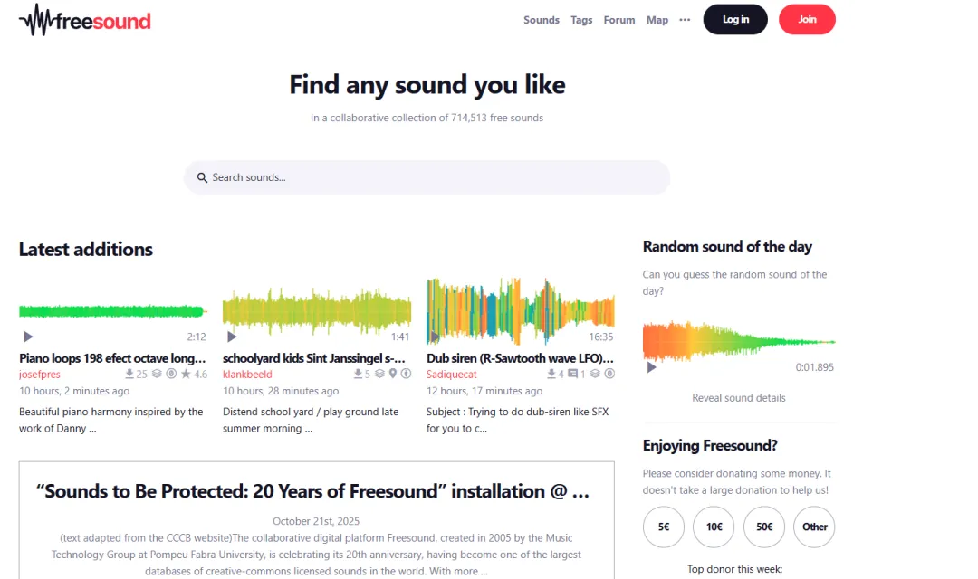 Freesound由巴塞罗那庞培法布拉大学于2005年创立,是全球历史最悠久的开源音效社区,依托CC0协议实现完全免费共享。平台拥有逾50万条用户贡献音效,节日庆典类超3万条,包括新年倒计时、万圣节音效等多元文化素材,资源规模庞大且持续增长。核心功能支持高级筛选(按“festival”“celebration”标签)、波形预览及批量下载,所有文件免版税,允许商用修改。其社区驱动模式确保音效真实多样,是独立创作者获取国际范节日音效的理想选择。