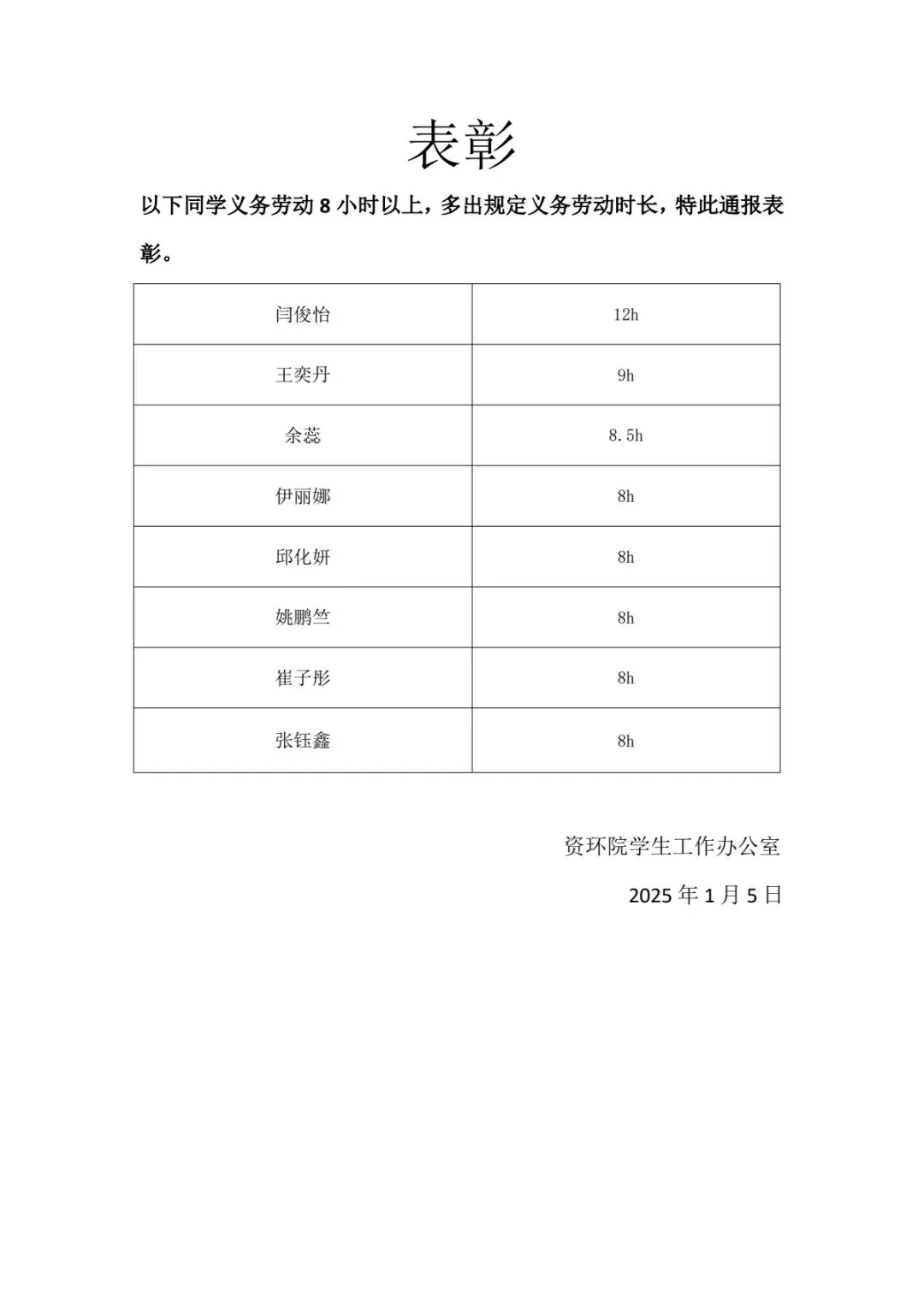 >【公示】资源与环境学院学生义务劳动时长多于规定时长表彰