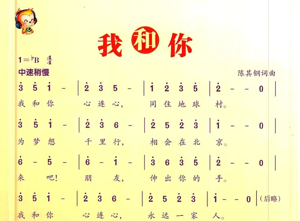 《我和你》是2008年北京奥运会开幕式的主题曲。由中国歌手刘欢演唱歌曲中文部分,英国歌手莎拉·布莱曼演唱歌曲英文部分。这首歌的词曲由北京奥运会开幕式音乐总监陈其钢所创作。歌曲结构方整、节奏舒展,是由四个乐句组成的单乐段。