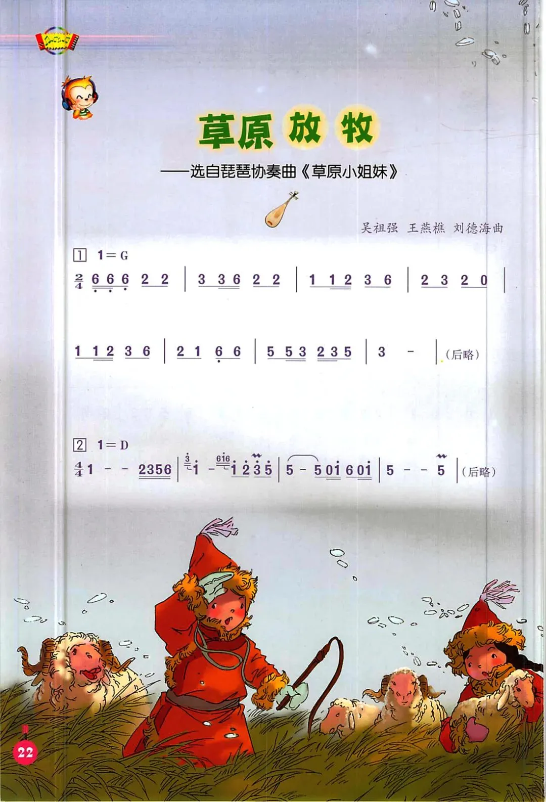 琵琶协奏曲《草原小姐妹》用独奏的民族乐器和西洋管弦乐队协同演奏,不仅具有鲜明的民族风格,还有着丰富的表现力。这部作品是根据蒙古族孩子龙梅和玉荣小姐妹为了保护集体的羊群和暴风雪搏斗的英雄事迹写成。全曲共分五段,《草原放牧》为其中一段。第一主题节奏轻快活泼、旋律灵活跳荡、速度较快,具有舞曲特点;第二主题音调宽广起伏、气息悠长、速度徐缓,两个主题性格不同却和谐地结合,构成丰满完成的艺术形象。