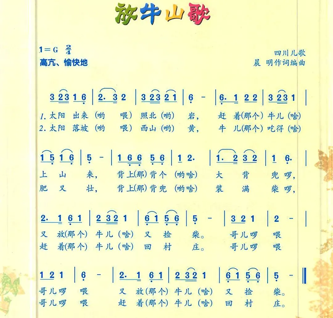 这是一首2/4拍、以农村题材为内容的歌曲。以“3、2、1”三个音为轴心,音乐素材简练、朴实,富有浓郁的生活气息。曲调欢乐、活泼,表现了牧童娃娃愉快劳动生活的欢乐情绪。