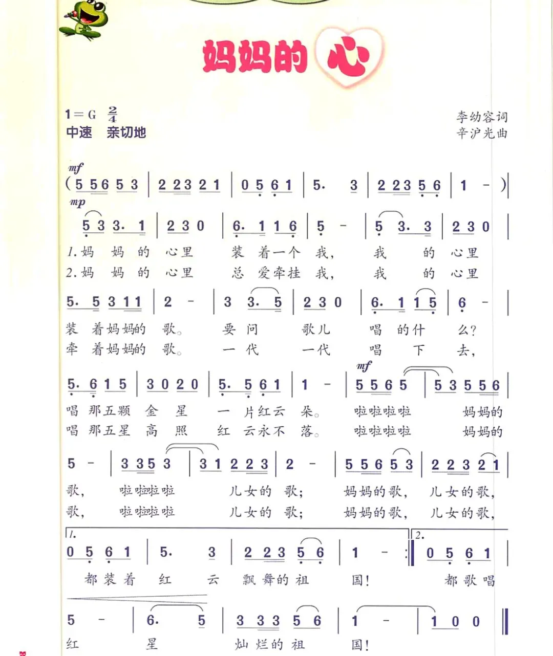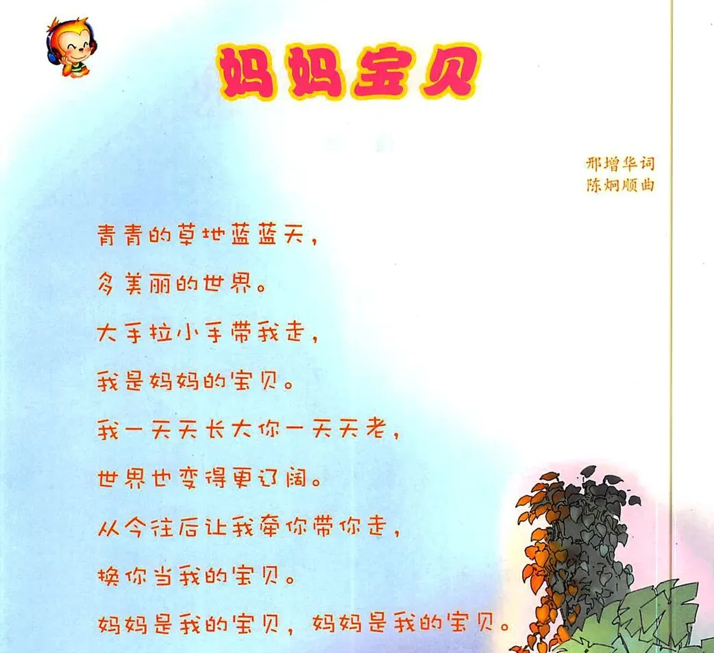 这首歌清新简单,流畅感人,歌曲体现了母爱的伟大,也表达了孩子们对妈妈深情的爱。歌曲4/4拍,结构简单,共四个乐句,按起承转合的形式发展。歌曲采用了童声和女声两种演唱形式,有分有合,更好地表现了孩子和妈妈那种亲密无间的爱。