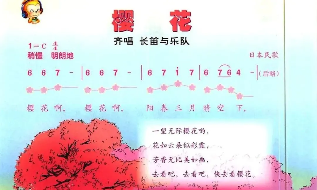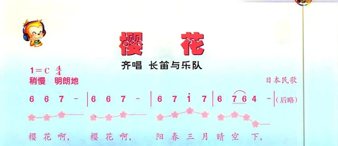 《樱花》这首歌纯朴而生动地表现了日本人民珍爱樱花,趁三月春光结伴前往观赏的喜悦之情。歌曲的旋律建立在日本民间“都节调式”的基础上,具有独特的民族风味。4/4拍以级进为主的旋律,平稳匀称的节奏,从容不迫的速度,使人联想到木屐的步履。