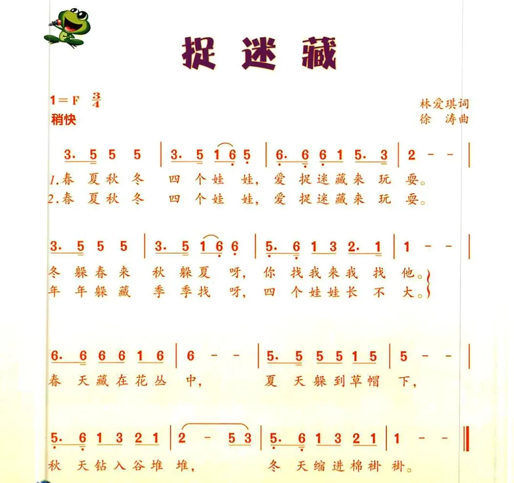 这是一首3/4拍、曲调规整、旋律活泼而又轻快的歌曲。歌曲为四个乐句组成的二段体结构,把“春、夏、秋、冬”四季的季节变化比拟成四个顽皮的小娃娃在玩捉迷藏游戏。形象生动,很有童趣,也表现了儿童对美好的大自然充满着热爱的情感。