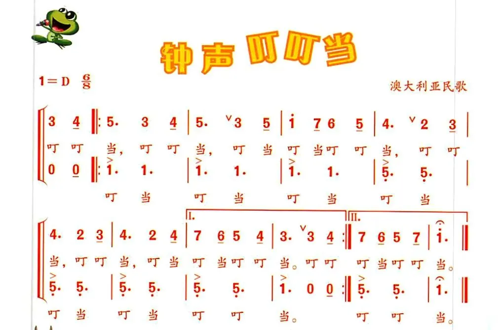 这是一首短小精悍,旋律优美的儿童歌曲。6/8拍,大调式。歌词“叮叮当”模拟了悠扬的钟声,仿佛使人聆听到美妙的钟声在空中回荡。全曲两个乐句,第二乐句是第一乐句下方三度的模进,歌曲合唱声部,只运用了两个音作为衬托,形成丰满悦耳的钟声效果。
