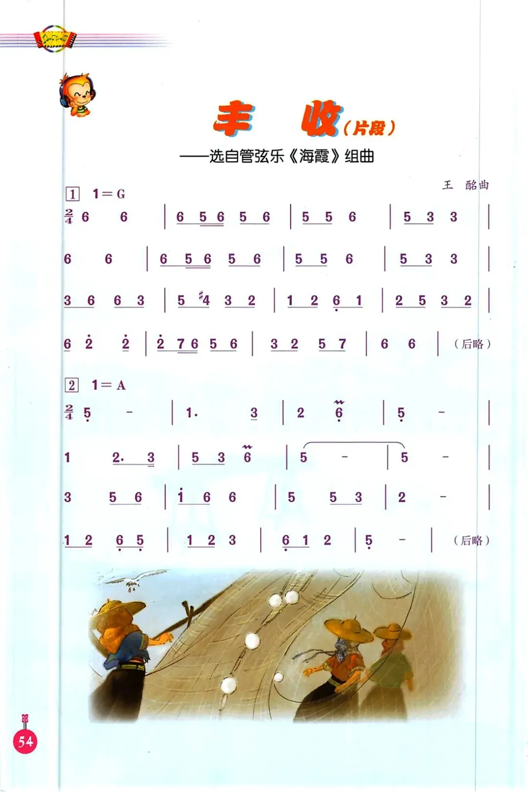 管弦乐曲《丰收》,原是影片《海霞》中的配乐。后由作者王酩本人将影片中的配乐整理改编成管弦乐《海霞组曲》,由《童年》《解放》《织网》《丰收》《胜利》五首乐曲构成。《丰收》一曲突出了欢快喜庆的气氛,整曲充满舞蹈性的节奏动感而愉悦人心。在曲式结构上,采用了两首风格迥然不同的舞蹈旋律加以组合,以抒发海岛渔民喜获丰收后的欢悦之情,前曲热烈而奔放,后曲则由弦乐营造出柔婉似水的婀娜多姿,情绪感人溢于曲外。