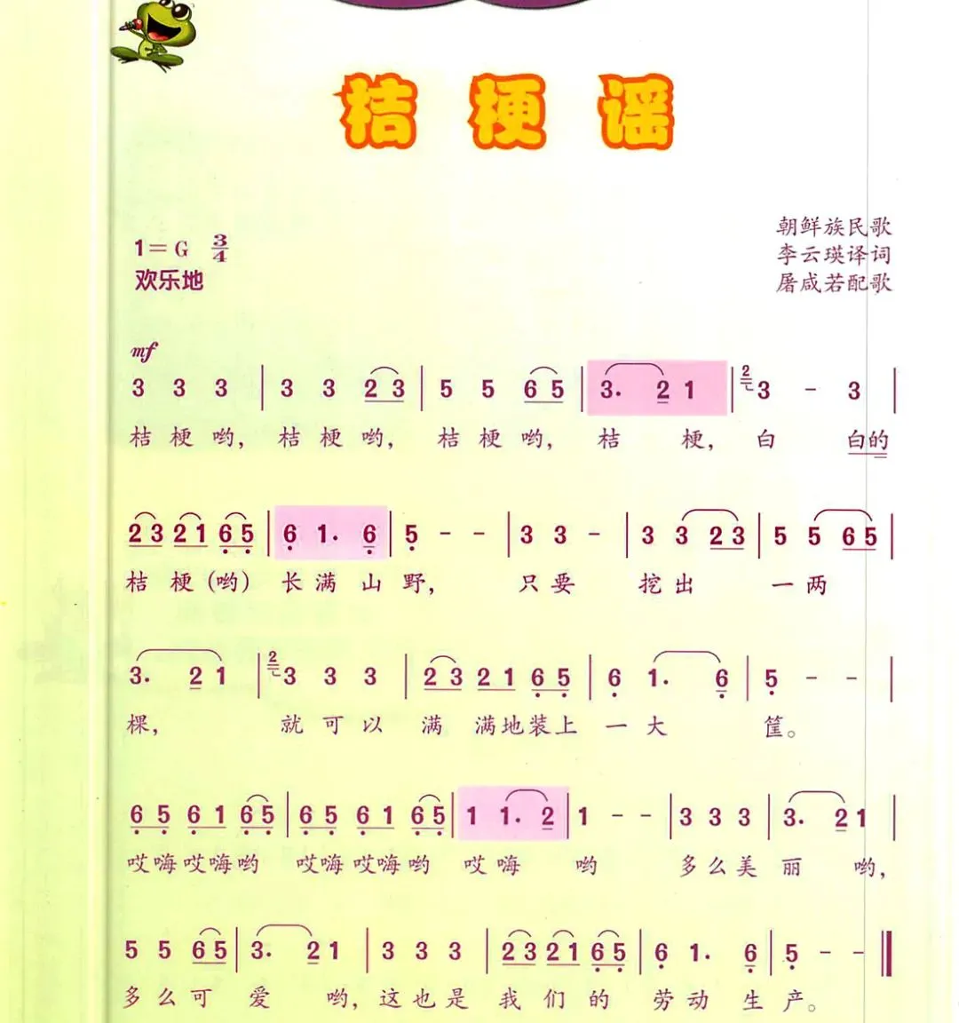 这是一首曲调优美、带有舞蹈性节奏的朝鲜族民歌。“桔梗”是朝鲜族人民爱吃的一种野菜,歌曲优美动听,富有舞蹈特点。歌曲采用3/4节拍,七个乐句组成一段体,音乐轻快明朗,生动地塑造了朝鲜族姑娘勤劳活泼的形象。