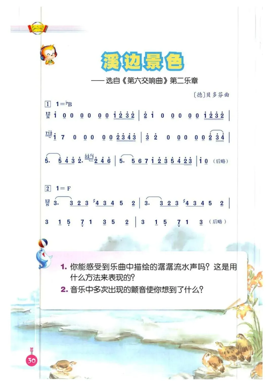 《溪边景色》是贝多芬《第六交响曲<田园>》的第二乐章,奏鸣曲式。第一主题旋律以弦乐为主,奏出三连音构成的小溪的潺潺水声为背景,使我们好像看到闪烁着波光的水面;第二主题包含两种音调,十分流畅,表现出清新宁静的抒情气息;展开部以发展第一主题为主;再现部上行琶音增强生活气息;尾声十分著名,在一幅鸟语花香的动人画面中结束。