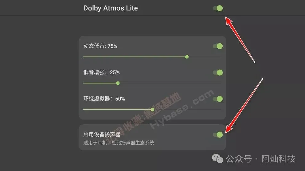 Dolby Atmos Lite 使用其实非常简单,只需想用的时候开启这两个开关就OK了。也可以根据自己的喜欢进行低音、虚拟环绕音的调节。
