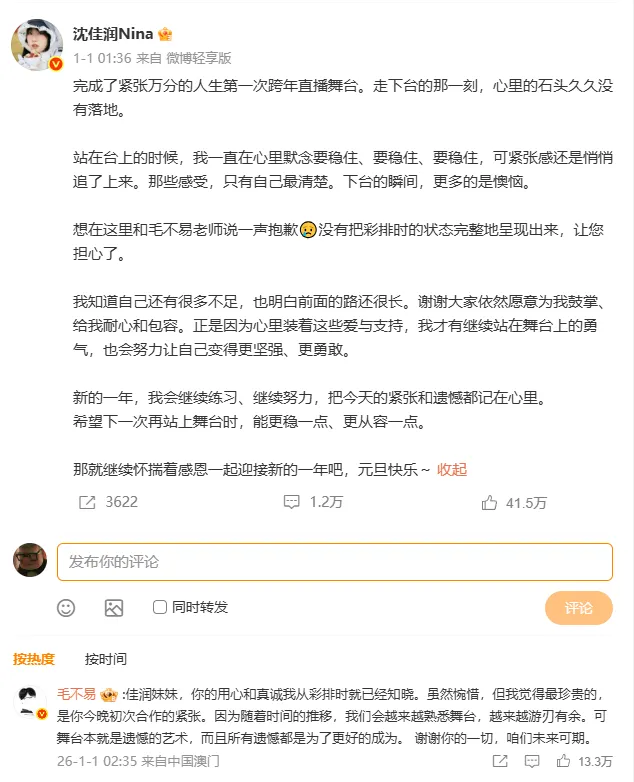刚刚过去的2025跨年演唱会,沈佳润与毛不易合唱《不染》,却意外成为了众人关注的焦点。沈佳润开场抢拍,跑调,紧张到气息不稳,这段翻车视频迅速在网络上流传开来,#谁来救救毛不易#这一话题瞬间冲上热搜榜首。