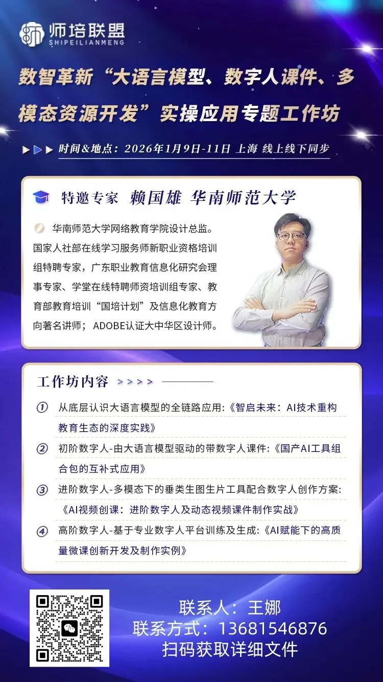 当前,人工智能技术正深刻重塑教育生态。教育部在《人工智能赋能教育行动方案》中明确指出,要加快推进AI与教育教学的深度融合,以技术变革驱动教育模式创新,培养适应智能时代需求的创新人才。这一政策导向充分体现了人工智能作为教育现代化关键驱动力的战略重要性。为贯彻落实教育部《教师数字素养》行业标准与“人工智能+教育”试点工作部署,突出国产AI技术在教育场景的创新应用。为了帮助教育工作者系统掌握AI教育应用的核心技能,推动智能技术在教学场景中的落地实践,构建人机协同的新型教育生态,促进智能技术与教育教学、科学研究深度融合,推动人工智能赋能教育转型,实现信息技术与教育教学深度融合,进一步提升学校本科课程建设质量,适应数字化时代的发展需求,我院决定2026年1月9日—11日在上海线上线下同步举办“数智革新‘大语言模型、数字人课件、多模态资源开发’实操应用专题工作坊”。现通知如下: