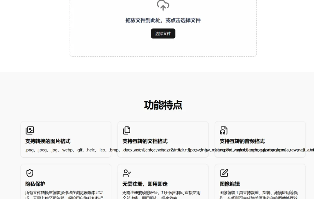 无需上传文件,所有操作都在浏览器本地完成,确保零数据泄露。支持图片、文档、音频等多种格式的无损转换,功能强大且安全。包括图片格式互转(如JPG、WebP、HEIC)、文档无损转换(如PDF、PPT、XLS)、音频采样率调整(如MP3、WAV、FLAC),还内置了图片旋转裁剪、PDF页面拆分、音频淡入淡出等高级编辑功能。