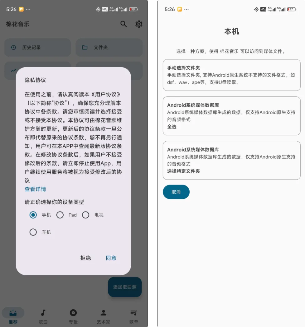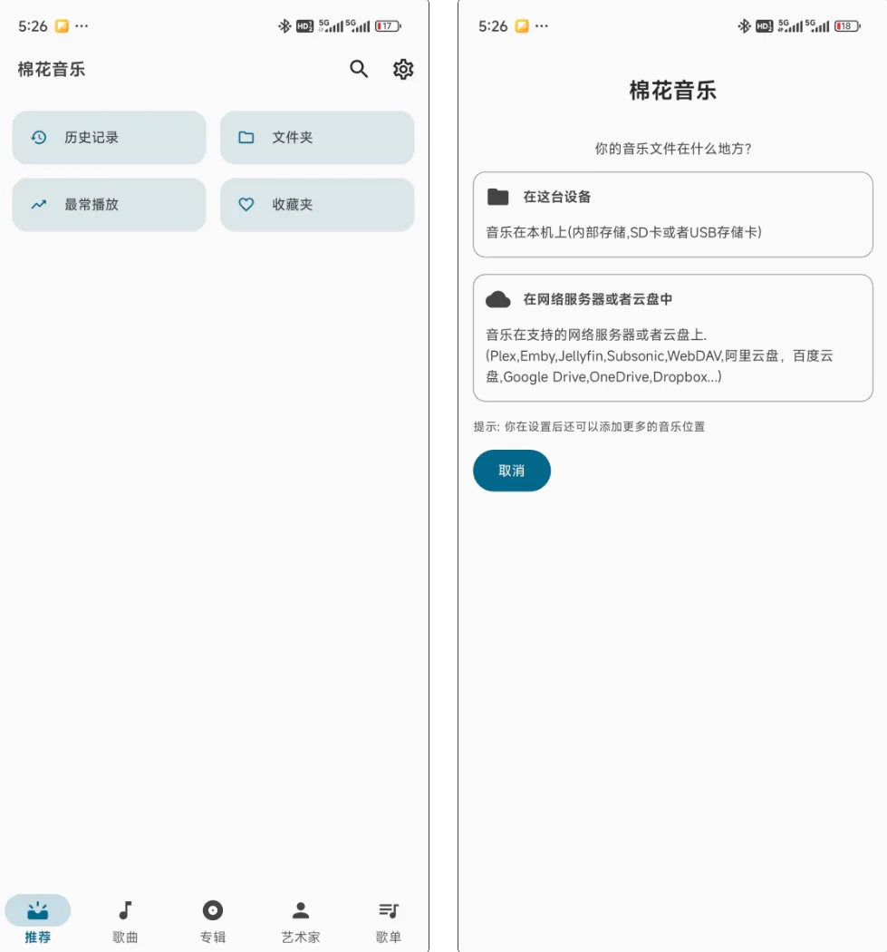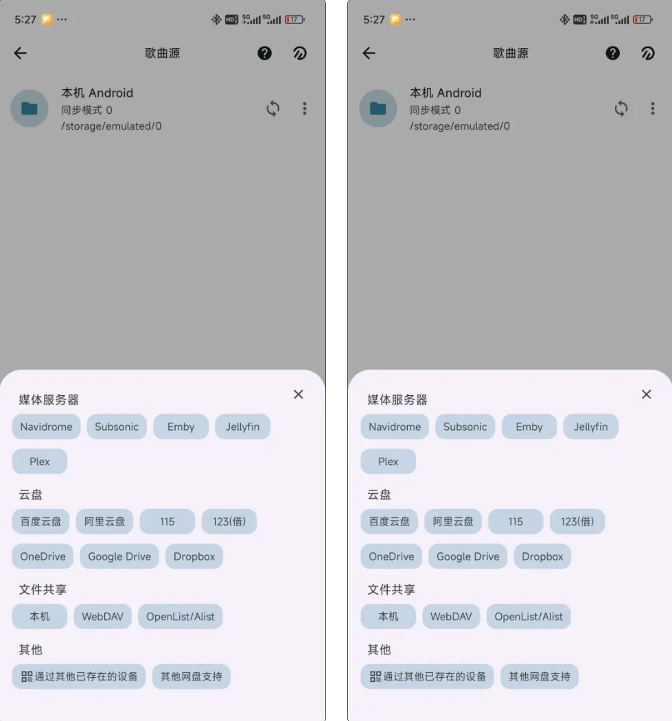 进入软件后需要选择设备类型,之后会弹出音乐源选择,这个时候选与不选都不会影响后面。退出后在首页可以看到添加音乐源,这时选择你存储的位置包括网盘,网盘写明支持百度网盘、阿里云盘、WebDAV、GoogleDrive、OneDrive、Dropbox等,选择对应网盘需要进行登录。