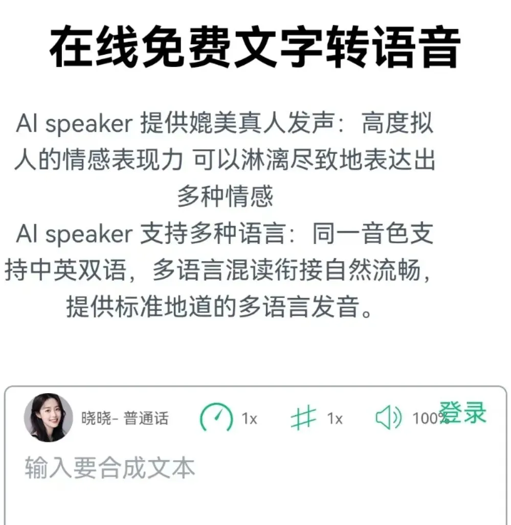 它内置20多个配音员,涵盖男女声,用户可自由调节语速、音量和语调。最多支持合成1000字文本,试听满意后可直接下载MP3文件。操作极其简便:粘贴文本、选择声音、一键导出,非常适合制作语音教程、播客素材或进行听力练习。