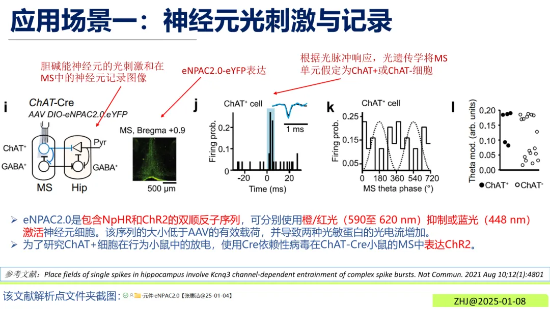 橙/红光(590-620 nm)照射时,NpHR作为离子泵发挥抑制效应,通过转运离子抑制神经元动作电位的产生。蓝光(448 nm)照射时,ChR2被激活,阳离子内流触发神经元快速放电。胆碱能神经元功能研究在ChAT-Cre小鼠的内侧隔核(MS)中表达eNPAC2.0,可通过光脉冲响应区分ChAT+与ChAT-细胞,解析胆碱能神经元的放电规律。