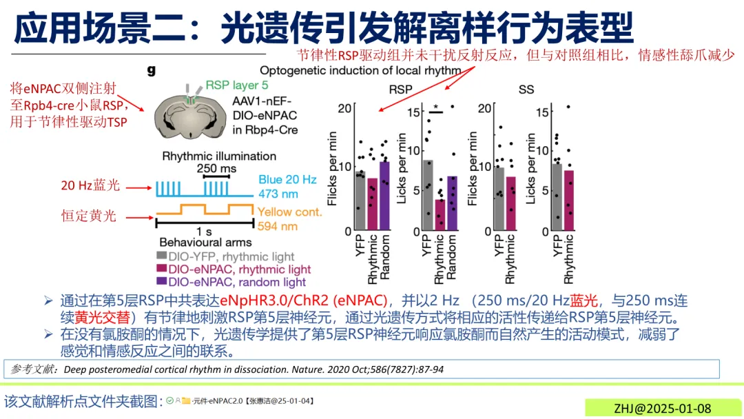 将eNPAC2.0双侧注射至Rpb4-cre小鼠的后内侧皮层(RSP),以2 Hz节律交替施加蓝光与黄光刺激,可模拟氯胺酮诱导的神经元活动模式,减弱感觉与情感反应的关联。