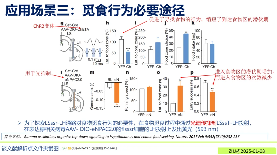 觅食行为环路解析在Sst-Cre小鼠中,通过黄光(593 nm)抑制表达eNPAC2.0的LSssT-LH投射神经元,可观察到小鼠进入食物区的潜伏期增加、次数减少,直接验证该通路对觅食行为的必要性。图3觅食行为必要途径
