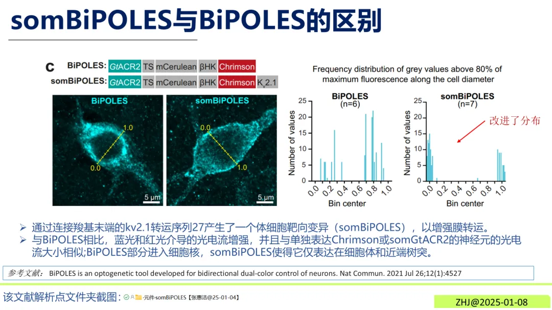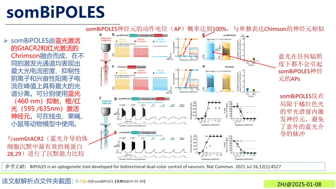 somBiPOLES是由蓝光激活的抑制型光敏蛋白“GtACR2”与红光激活的激活型光敏蛋白“Chrimson”融合而成的新型元件。相比原型BiPOLES,它通过连接羧基末端的“kv2.1转运序列”实现体细胞靶向表达,仅分布于细胞体与近端树突,避免了核内定位问题,同时提升了光电流强度。其核心优势在于抑制性阴离子与兴奋性阳离子电流的峰值具有最大光谱分离度,操控精准度更高。