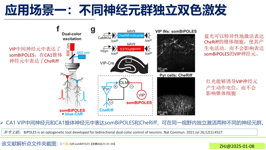 小鼠海马体CA1区,将somBiPOLES表达于VIP中间神经元,同时在锥体神经元中表达CheRiff。红光可特异性激活VIP神经元,蓝光则精准激活锥体神经元,实现同一视野内两种神经元群的无交叉调控。