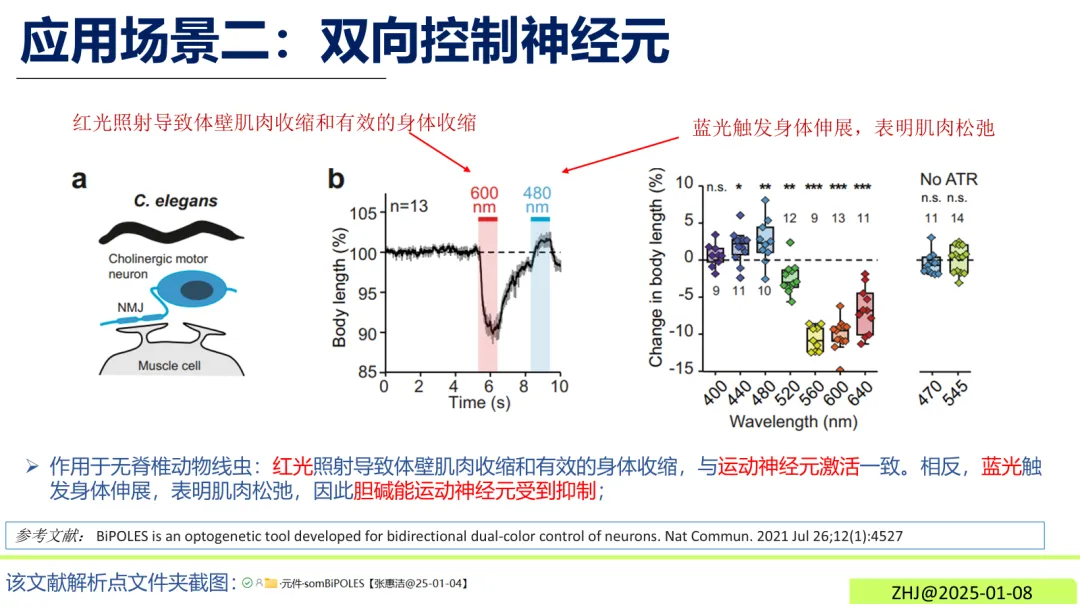 无脊椎动物的运动调控研究发现,在线虫模型中,红光照射可引发体壁肌肉收缩,蓝光则触发身体伸展,清晰解析胆碱能运动神经元的激活与抑制效应。