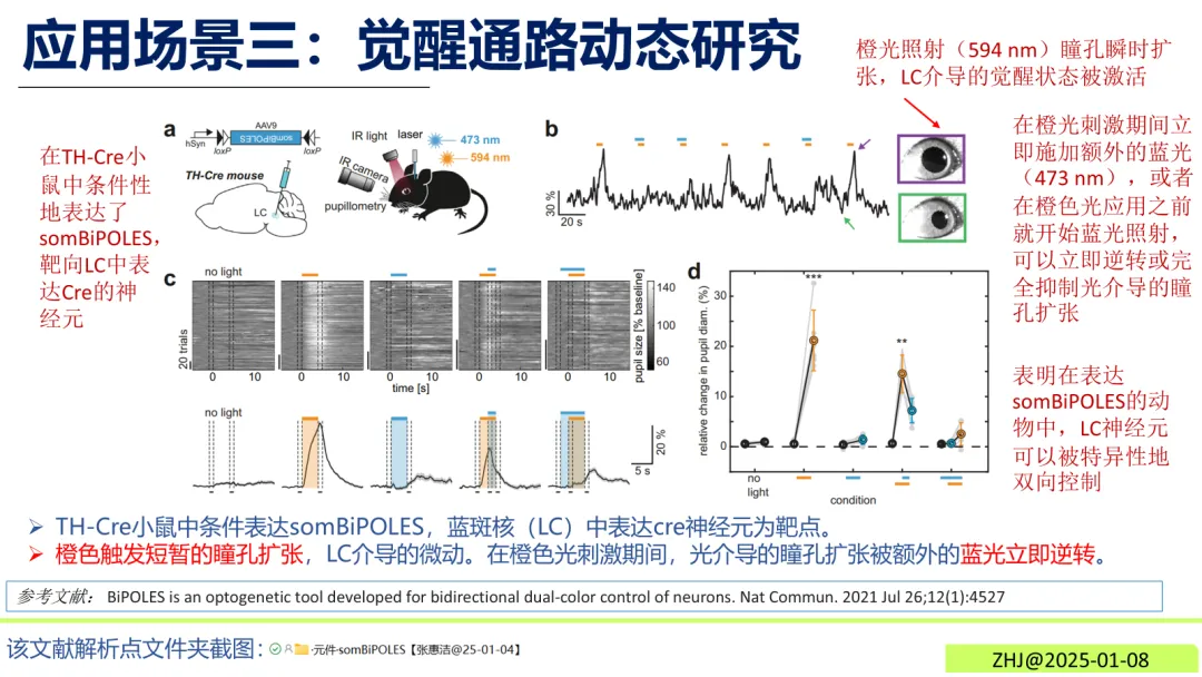 TH-Cre小鼠的蓝斑核(LC)神经元中表达somBiPOLES,橙色光(594 nm)照射可触发瞳孔扩张,标志着觉醒状态激活;施加蓝光(473 nm)则可立即逆转该效应,实现对觉醒通路的动态双向操控。