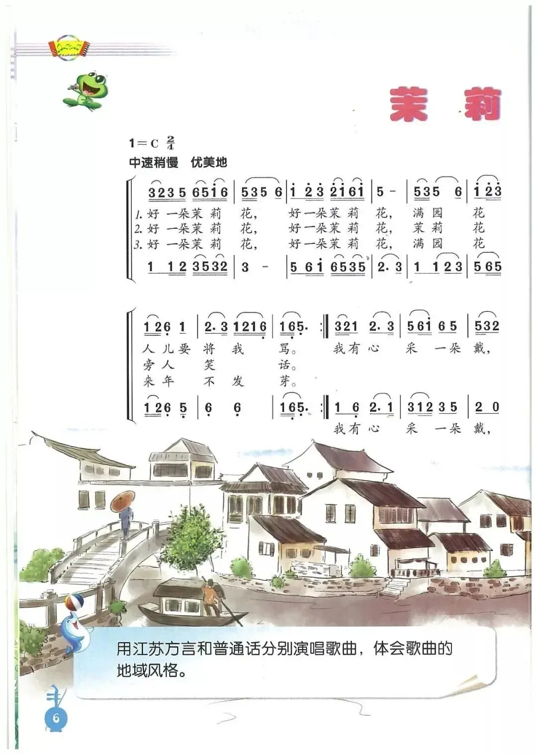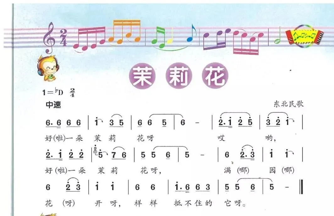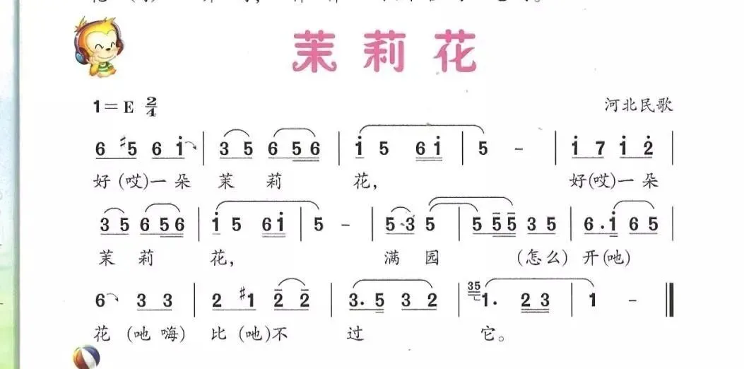 河北民歌《茉莉花》音域宽阔,明快嘹亮,具有中国北方小调的风格特点。唱词上第一段与江苏民歌《茉莉花》相同,第二、三、四段中叙述了《西厢记》中张生和崔莺莺的爱情故事,全曲旋律起伏较大,跳进较多,还运用了吕剧“四平腔”常用的拖腔,给人以刚直、爽朗之感。