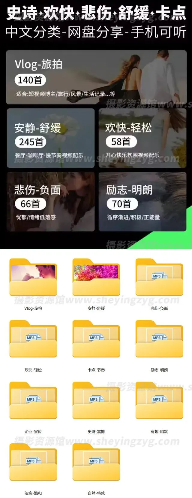 Vlog-旅拍、安静-舒缓、悲伤-负面、欢快-轻松、卡点-节奏、励志-明朗、企业-宣传、史诗-震撼、有趣-幽默、治愈-温和、自然-特效