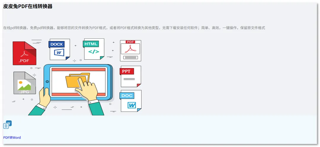 皮皮兔PDF在线转换器是一款在线PDF转换工具;网站支持全平台访问。