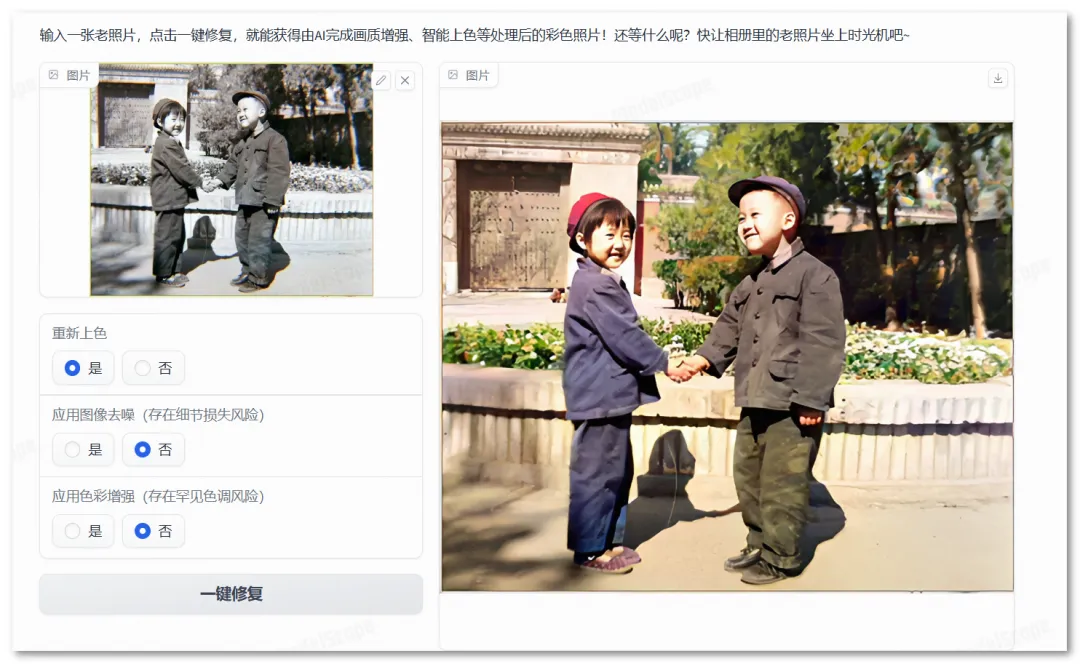 它操作简单,修复速度快,效果出色。支持智能上色、画质增强,下载修复后的图片。还具备图像去噪和色彩增强功能。总体而言,它是老照片焕新的神器,效果令人惊艳。AI 老照片修复:
