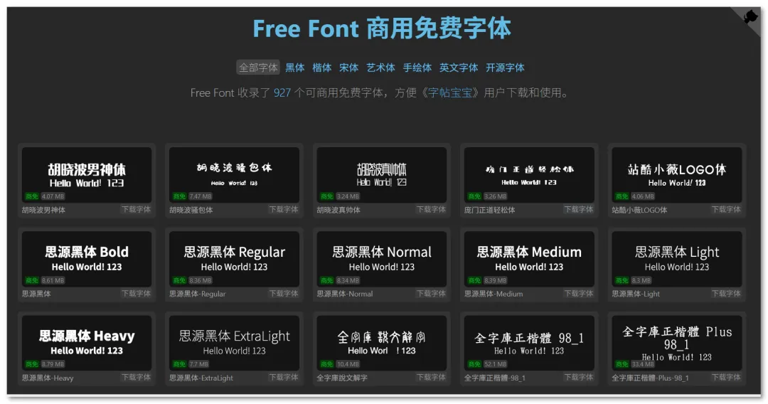 它界面干净,无需登录,收录 920 多款可商用字体,涵盖黑体、楷体等多种风格。支持在线预览下载。总体而言,它是字体资源的宝库,满足日常办公设计需求。