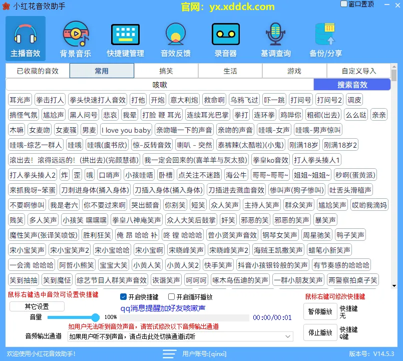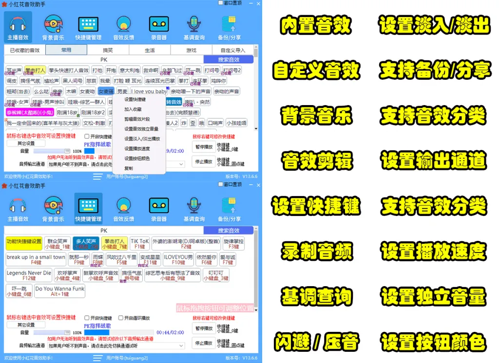 小红花直播音效助手,专为主播打造,是各大平台主播活跃气氛的必备软件助手,极力推荐! 内置上千款常用音效,包括抖音,流行歌曲高潮部分,保持更新,任您选择! 是各大平台主播活跃气氛的必备软件助手