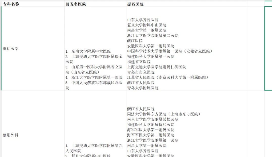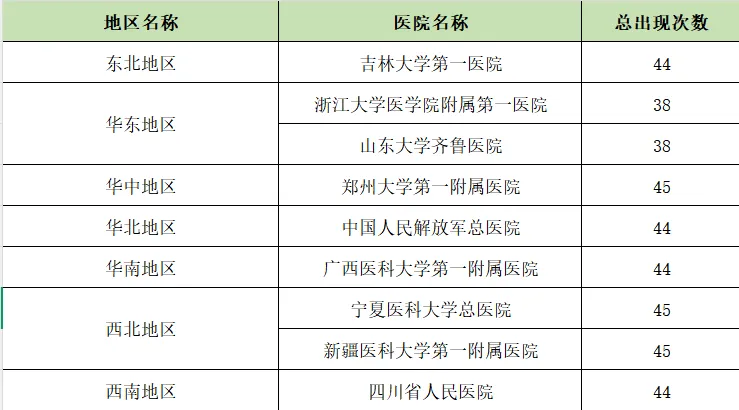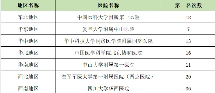 之前,我分析过南京市的各个医院的医疗资源情况,知道了南京市最好的医院是江苏省人民医院,其次是鼓楼医院。(详见文末:历史文章)现在,让我们把目光放长远一些,纵观全国,看看中国七大地区(华东、华南、华北、华中、西南、西北、东北)的医疗资源分布情况,数据直接来源为权威的复旦版中国医院排行榜网站,部分截图如下。各个地区进入榜单(包括提名)的医院总数如下,其中,华东、华北、华南地区的医院数量遥遥领先,这说明这三大地区的总体医疗资源处于领先优势。如果一个医院在不同专科的排行榜反复出现,说明这个医院的综合实力最强。以下表格中,统计了各个地区,出现次数最多的医院,所以这些医院是各地区最好的。(类似于总分最高的学生)如果一个医院在不同专科的排行榜第一名中出现频率最高,说明这个医院的核心实力最强。(类似于单科拿第一名次数最多的学生)上海市:4家(上海交通大学医学院附属仁济医院、上海交通大学医学院附属瑞金医院、复旦大学附属中山医院、复旦大学附属华山医院)
