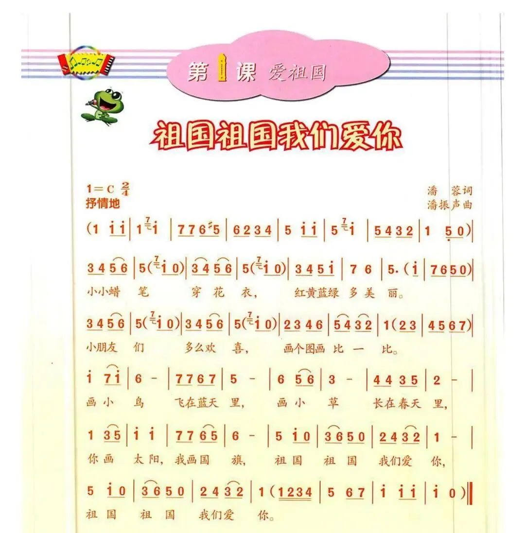 《祖国祖国我们爱你》 是一首2/4拍、欢快的儿童歌曲。歌词以生动形象的语言和情境创设, 展现了小朋友们丰富的想象力和用画笔表达爱祖国的纯真心灵。歌曲为单二部曲式,第一乐段平稳级进,第二乐段舒展抒情。