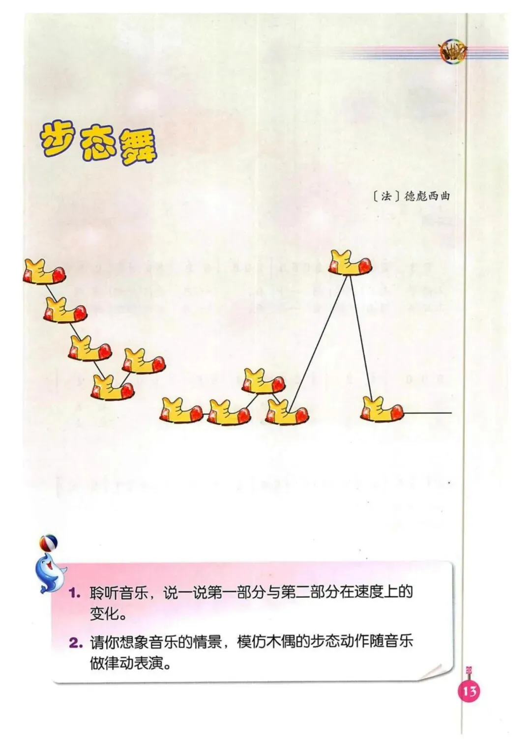 法国作曲家德彪西于 1910 年为其爱女写了题名为 《孩子们的角落》 ( 也译作 《儿童乐园》) 的钢琴曲集, 包含六首小曲。《木偶的步态舞》是曲集中的最后一首。曲中大量运用切分音和带顿音的八分音符, 这是美洲黑人糕饼舞音乐的常用节奏, 因此这首钢琴小曲成为欧洲音乐作品中吸收黑人舞蹈音乐的先例。乐曲以此描绘一个红眼黑面、毛发耸然、外形奇特的黑人小木偶跳舞的滑稽形象。