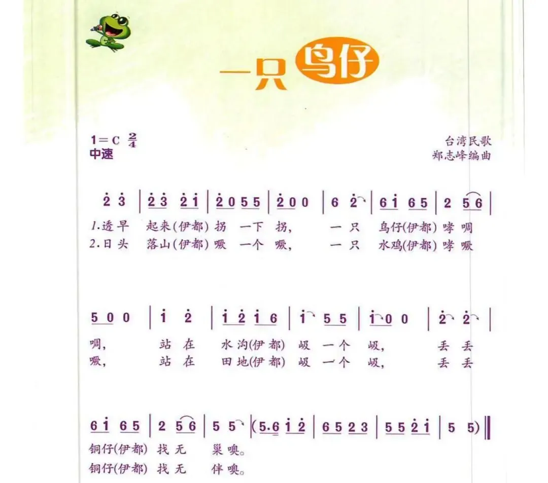 这是流传在我国台湾地区的一首儿歌。2/4拍,五声徵调式,在两段歌词中, 分别表现了一只失去鸟巢, 找不到家的鸟仔和一只失去伙伴找不到伴儿的水鸡在水沟、田地间鸣叫的情形。全曲四个乐句,每句四小节,曲式属于典型的“起承转合”,四个乐句的节奏型几乎完全相同。下滑音、衬词等使得歌曲具有浓郁的地方色彩。