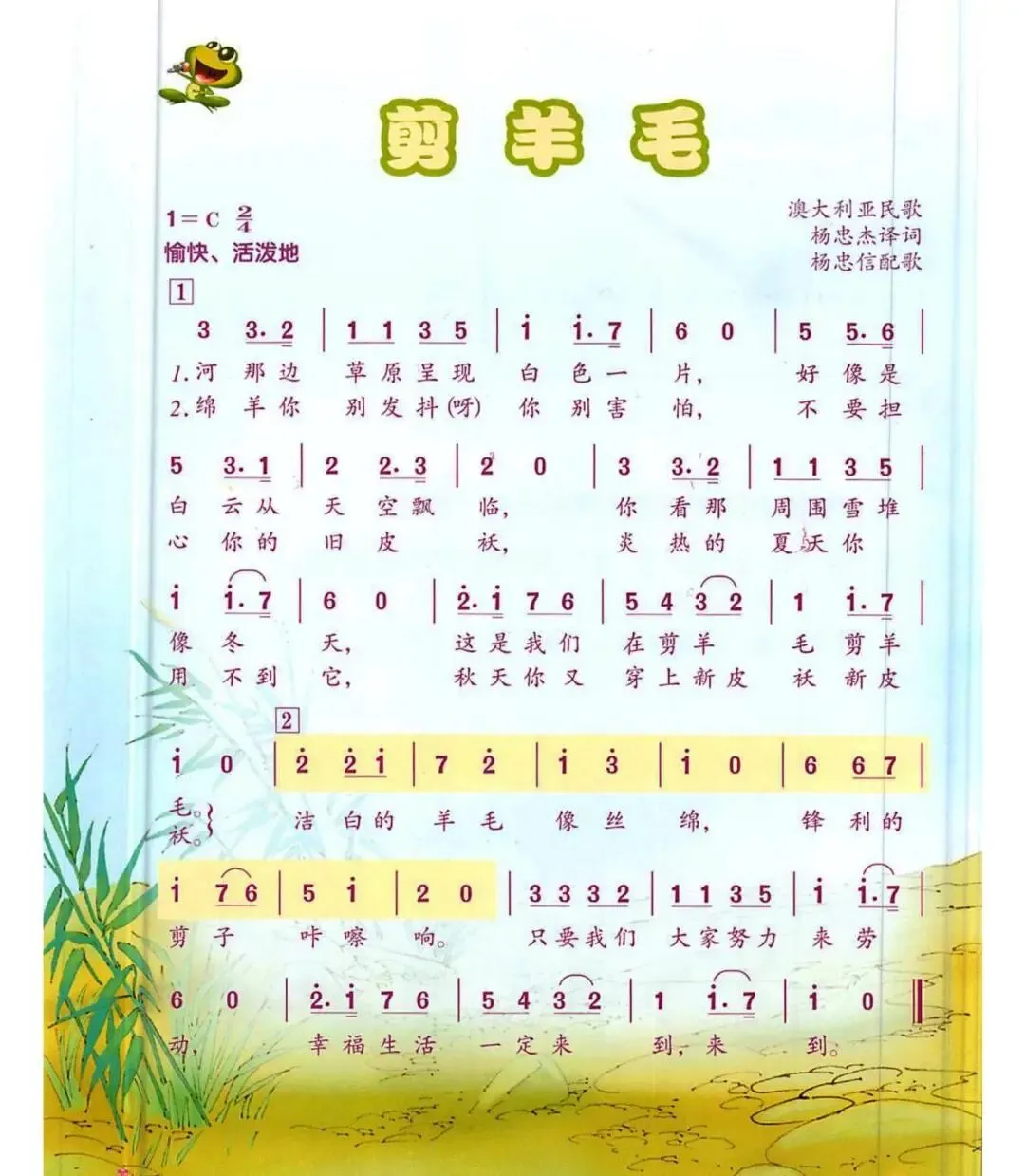 这是一首澳大利亚民歌,歌词以生动的语言、形象的比喻描绘了 " 剪羊毛" 这一劳动情景, 富于想象,很有童趣。歌曲为2/4拍,二段体结构。第一乐段有四个方整的乐句,第二乐段前两个乐句旋律起伏变大,节奏明快,与前段形成鲜明对比,后两个乐句再现了第一乐段的后两句。