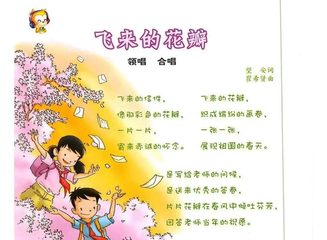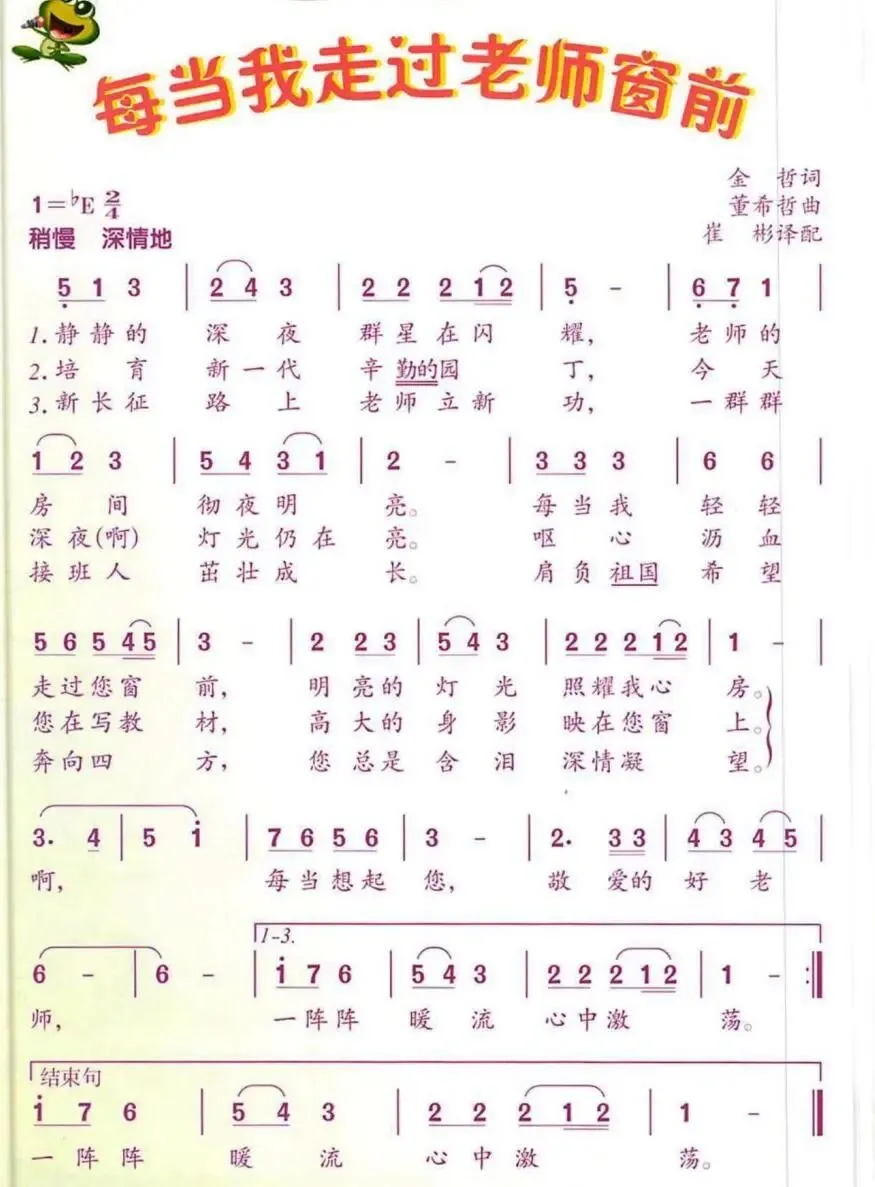 这是一首意境优美、情感动人的抒情儿童歌曲, 它歌颂了老师为培养一代新人而呕心沥血、忘我工作的精神,也表达了孩子们对老师的崇敬、热爱之情。歌曲为2/4拍,二段体结构。第一乐段为节奏平稳、旋律流畅的四个乐句,第二乐段是歌曲的副歌,曲调级进上行,起伏较大,最后一句用下行表达了热爱之情。