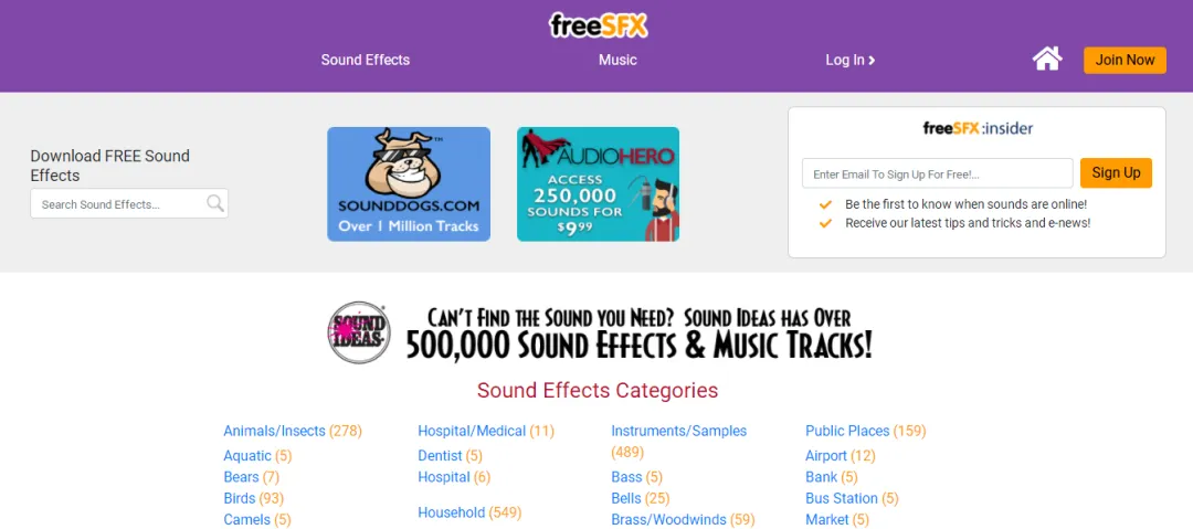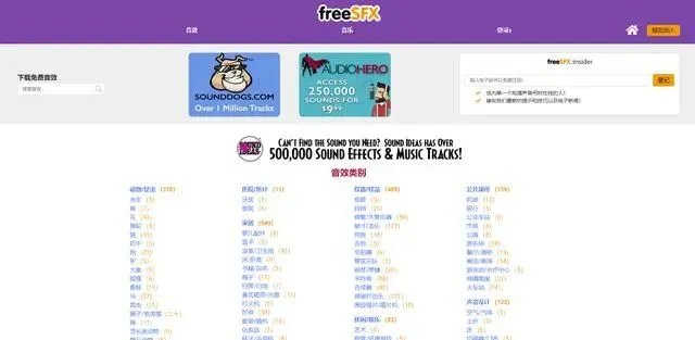 一个免费音效音乐下载网站,里面的音效素材有5万多个,音乐素材的话有900多个,都有详细的分类,可以根据分类查看音乐或者音效,也可以直接搜索。