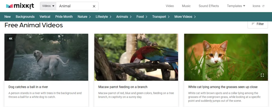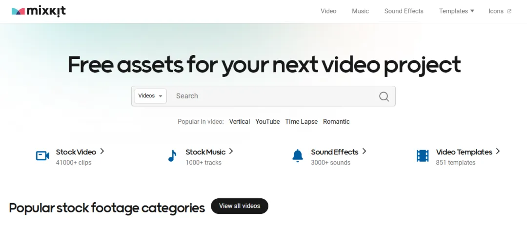一个免费无版权素材网站,它里面有视频素材、音乐素材、音效素材和视频模板,音乐素材有1000多个,音效素材有3000多个。