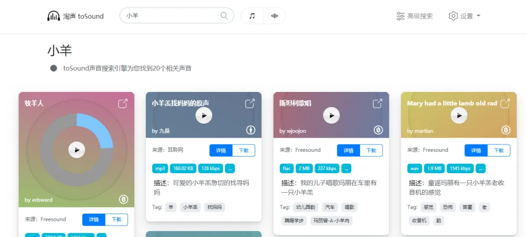 一个声音搜索引擎,它里面汇集了全球海量的声音资源,包括声音素材、游戏音效、影视配乐、实地录音、音乐样本等等,不管你需要什么类型的音效素材都可以在这里搜索。