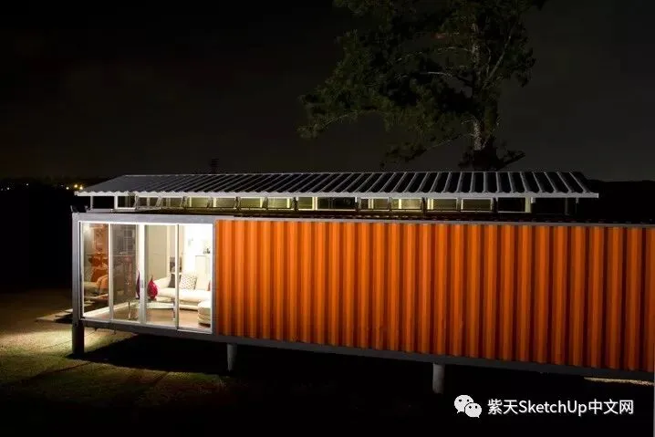 整套建筑面积800平方英尺,由两个40英尺的废旧集装箱和一个中部连结区域组成,连结区域还有漂亮的天窗。